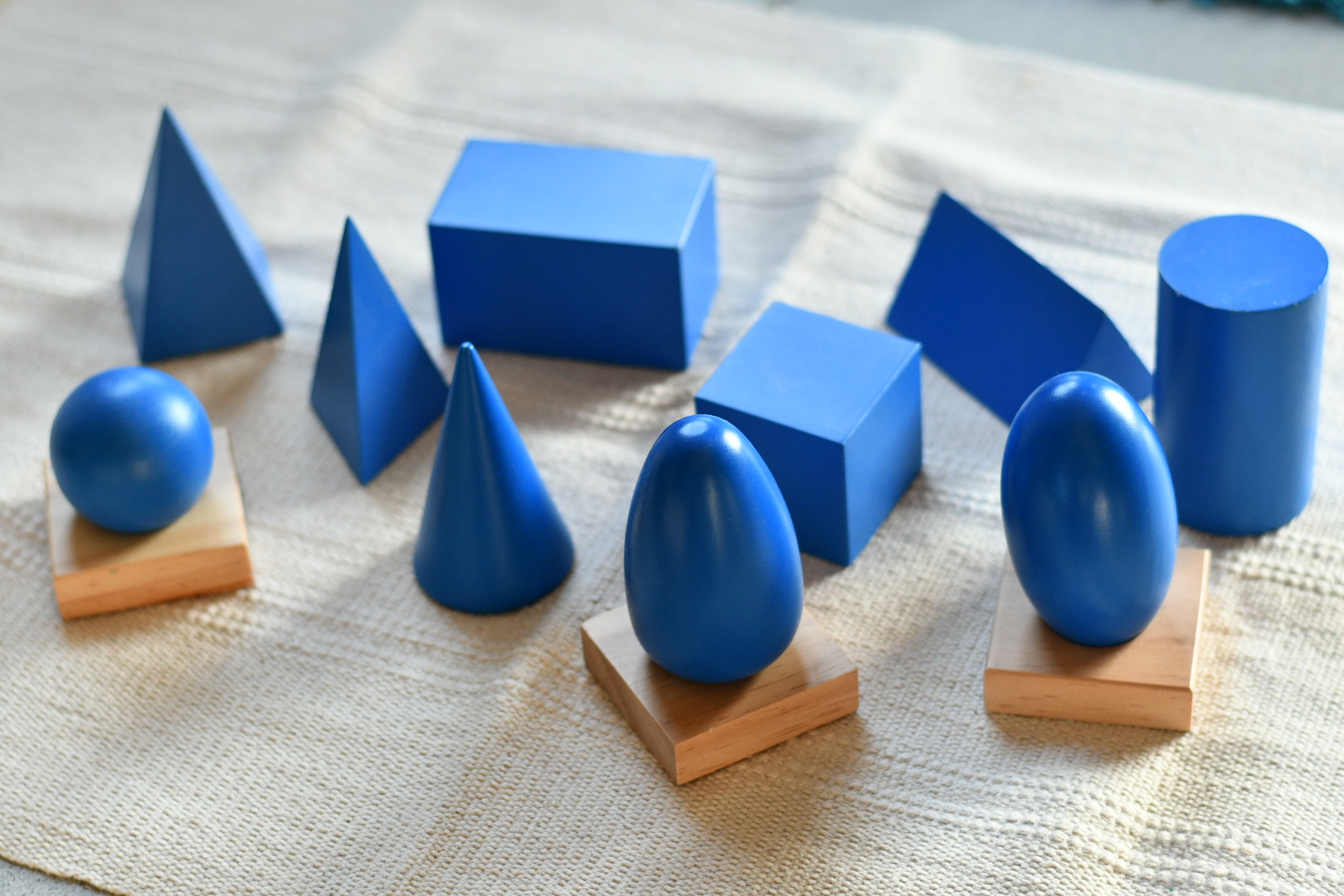 Le matériel se compose d’une boîte contenant 10 solides géométriques : une sphère, un cône, un cube, un pavé (un parallélépipède), une pyramide à base carrée, une pyramide à base triangulaire, un ovoïde, un ellipsoïde, un cylindre et un prisme à base triangulaire, 5 bases, 3 socles (permettant de faire tenir debout la sphère, l’ovoïde et l’ellipsoïde).