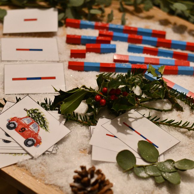 Les barres rouges et bleues L’enfant va associer la voiture avec le chiffre et la barre rouge et bleue correspondante. Le matériel des barres rouges et bleues est un d