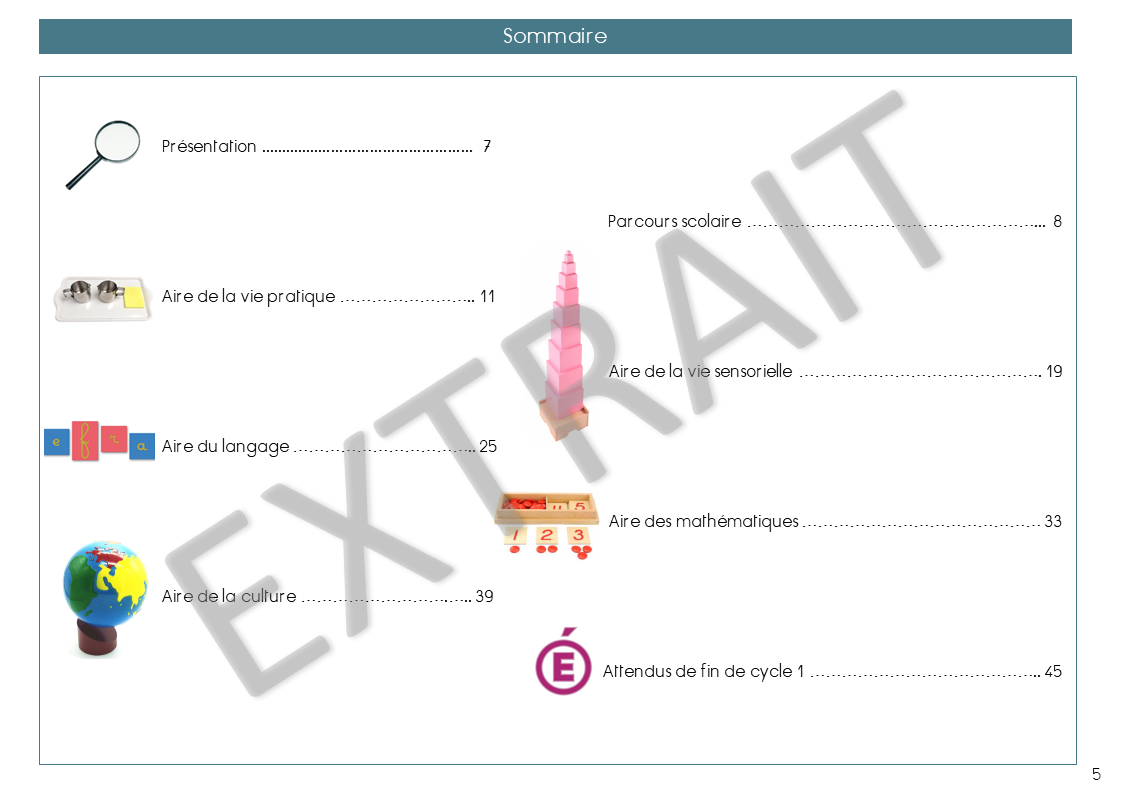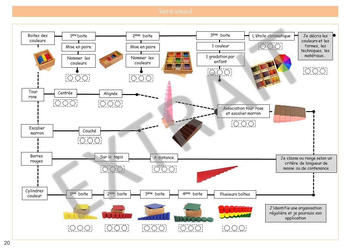 Si le point est colorié en vert : cela signifie que l’activité est acquise par l’élève. Dans chacune des aires, vous trouverez une progression. Tout le matériel y est présenté et le lien est fait avec les programmes de l’éducation nationale. L’ensemble du matériel Montessori 3-6 ans dépassant les attentes des programmes de maternelle, vous ne trouverez parfois pas de compétence du cycle 1.